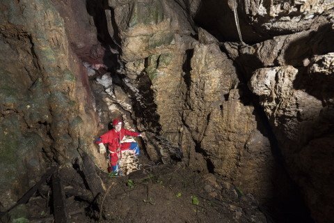 Mihi je uspelo razširiti ožino na globini 24 m in spustila sva se v okoli 15 m globoko brezno. Sam sem medtem splezal in skrbno pregledal vse kamine, špranje in luknje in … žal se ne da nikjer naprej. Po dnu dvorane v nadaljevanju so veliki balvani, med katerimi sva prosto splezala še kakšnih 10 m v globino. Plazenje med bloki ni nikoli varno, še največ prostora je bilo med temi bloki in korozijsko močno obdelanimi jamskimi stenami. Te so sicer relativno čiste, a so mestoma med bloki debeli sloji mastne oranžne ilovice. Blatno, da je kaj! Proti dnu vodi več ozkih jaškov in v enem izmed njih sva dosegla najnižjo točko. V ozek in neprehoden rov se vidi vsaj še 3 m globlje, kamen pa se od tam odbije vsaj še kakšnih 5 m vstran in v globino. S širjenjem te ožine bi lahko prišli še globlje, a sva soglašala, da na tej točki pritisneva piko.