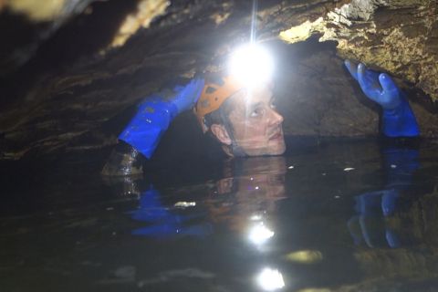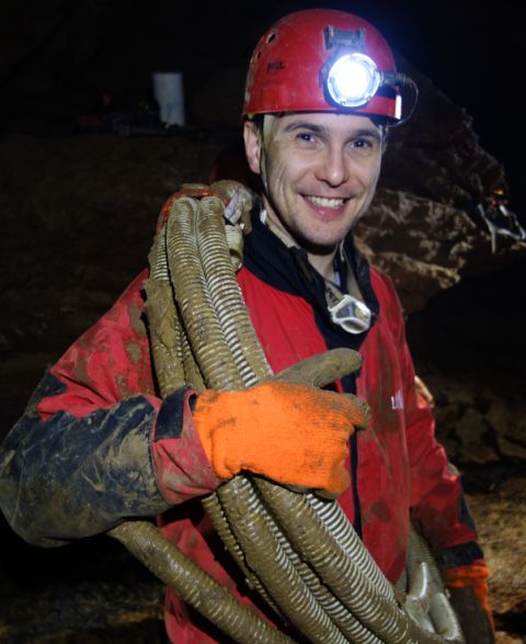 K sreči je do našega cilja vodil nekoliko višji vzporedni rov. Hitro smo se razdelili v ekipe. Prva je proti končnemu sifonu odšla črpalna ekipa v zasedbi Aleš, Zdravko in Jože. Plavalca Mitja in Anže sva počakala Tomaža in Dominika, ki sta pričela z merjenjem za 3D načrt jame.