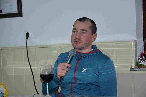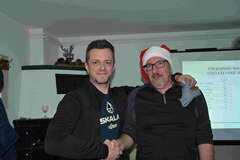 Predsednik Zdravko Bučar čestita Damijanu Šinigoju za njegove dejavnosti. Ne le v klubu, ampak tudi v JRS in JZS ter urednikovanjem revije Jamar.